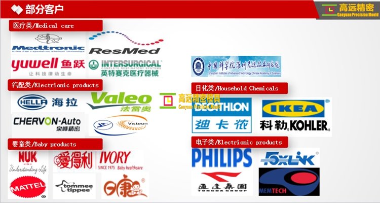 公司依靠誠信經營和一流的品質立足於行業。客戶遍布全球,並與多家國內外知名品牌公司建立了長期戰略合作關係其中包括美敦力、中國科學院、魚躍醫療、泉峰汽配、延鋒偉世通、飛利浦、富港電子、科勒、迪佧儂、帝爾特、NUK等。公司不斷提高自身技術水平,不斷為客戶提供高品質,高效率的服務,真誠期待與廣大客戶攜手共創輝煌!
